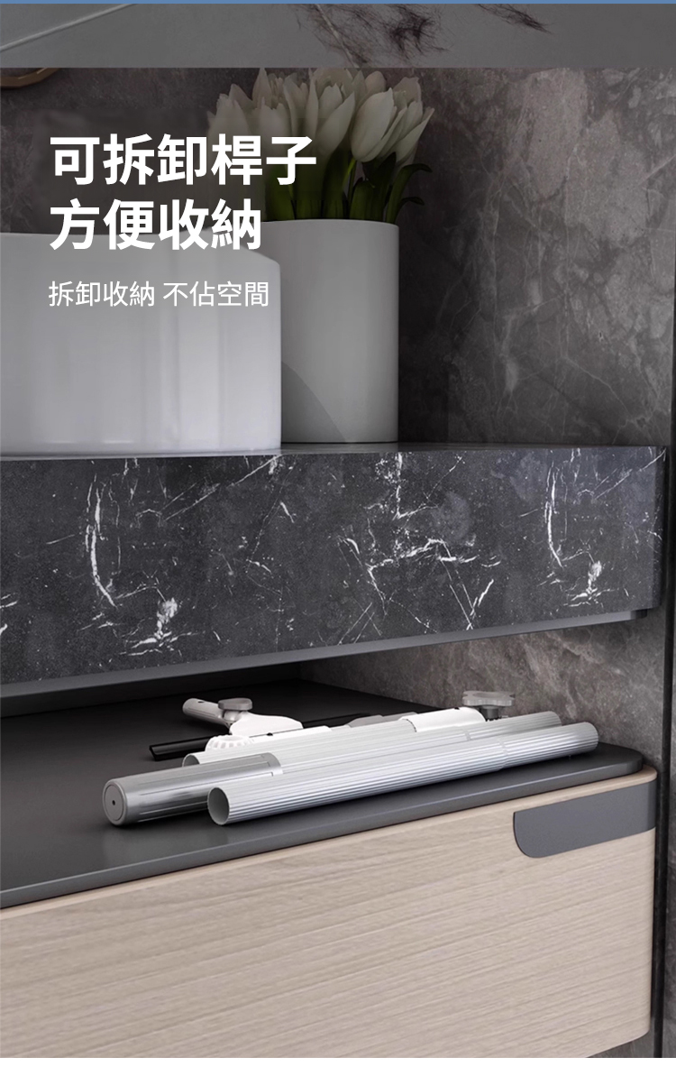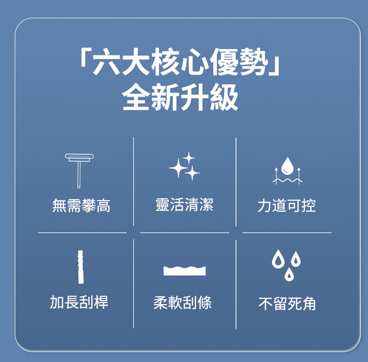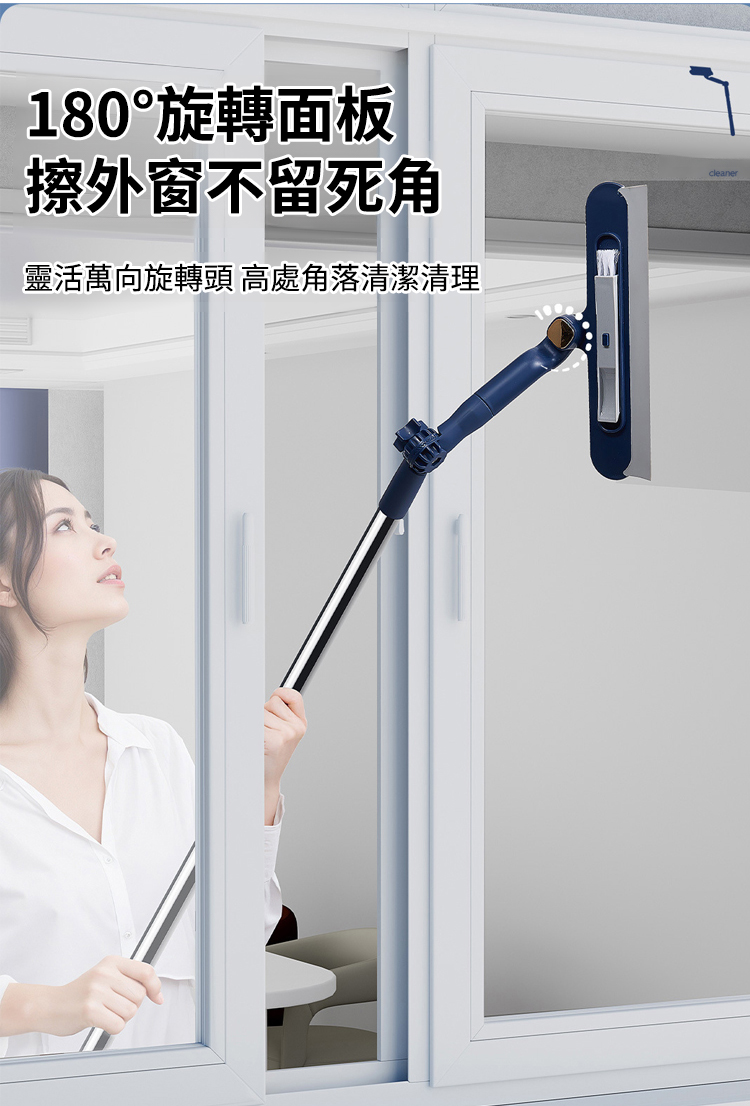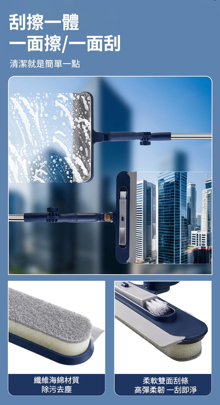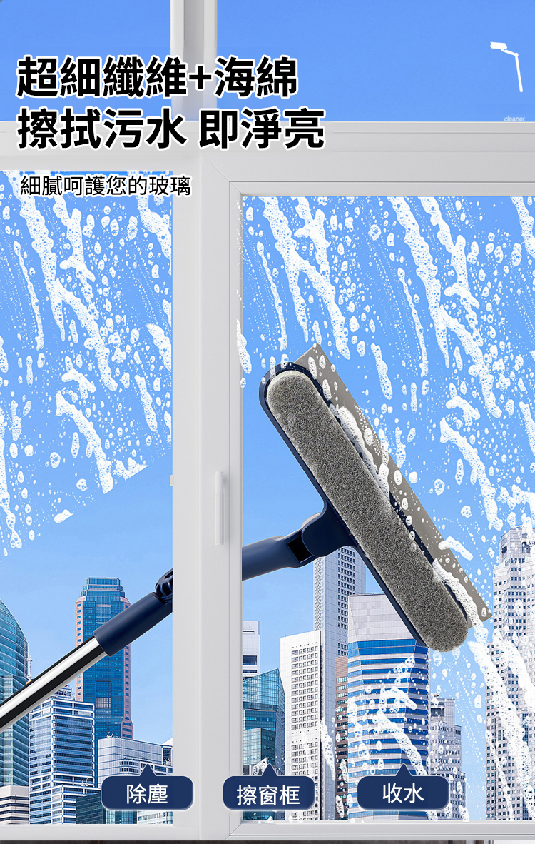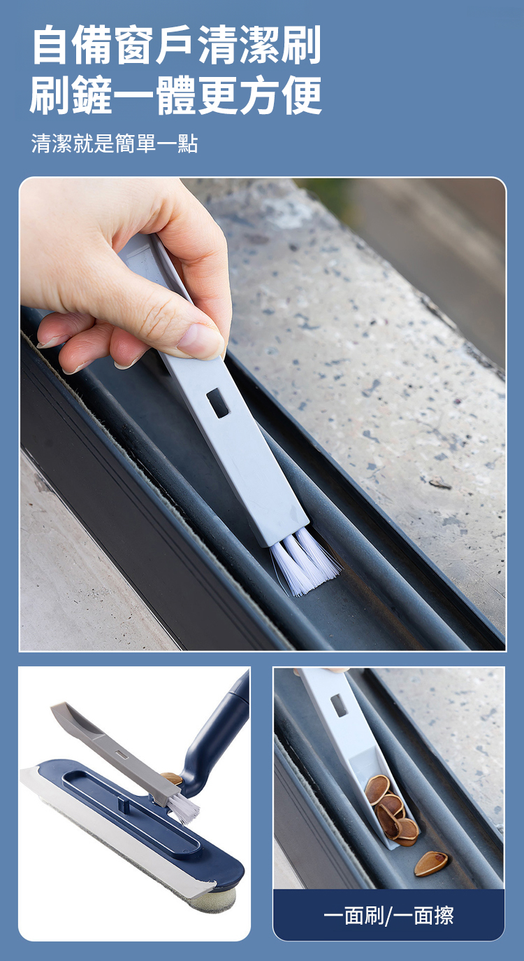 採用 「一面刷 / 一面擦 / 一面刮」 的設計,一刮即淨,無需反覆清潔,還能兼顧擦窗框,實現除污、去塵、收水多效合一