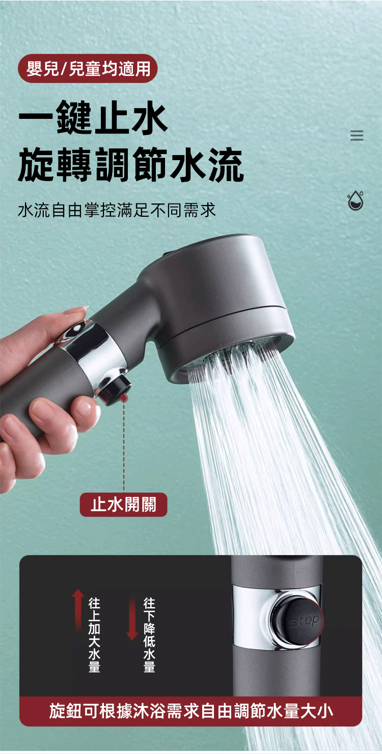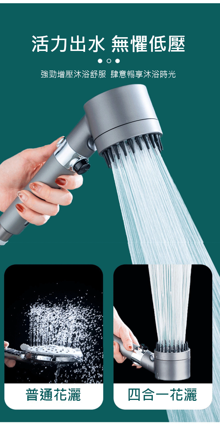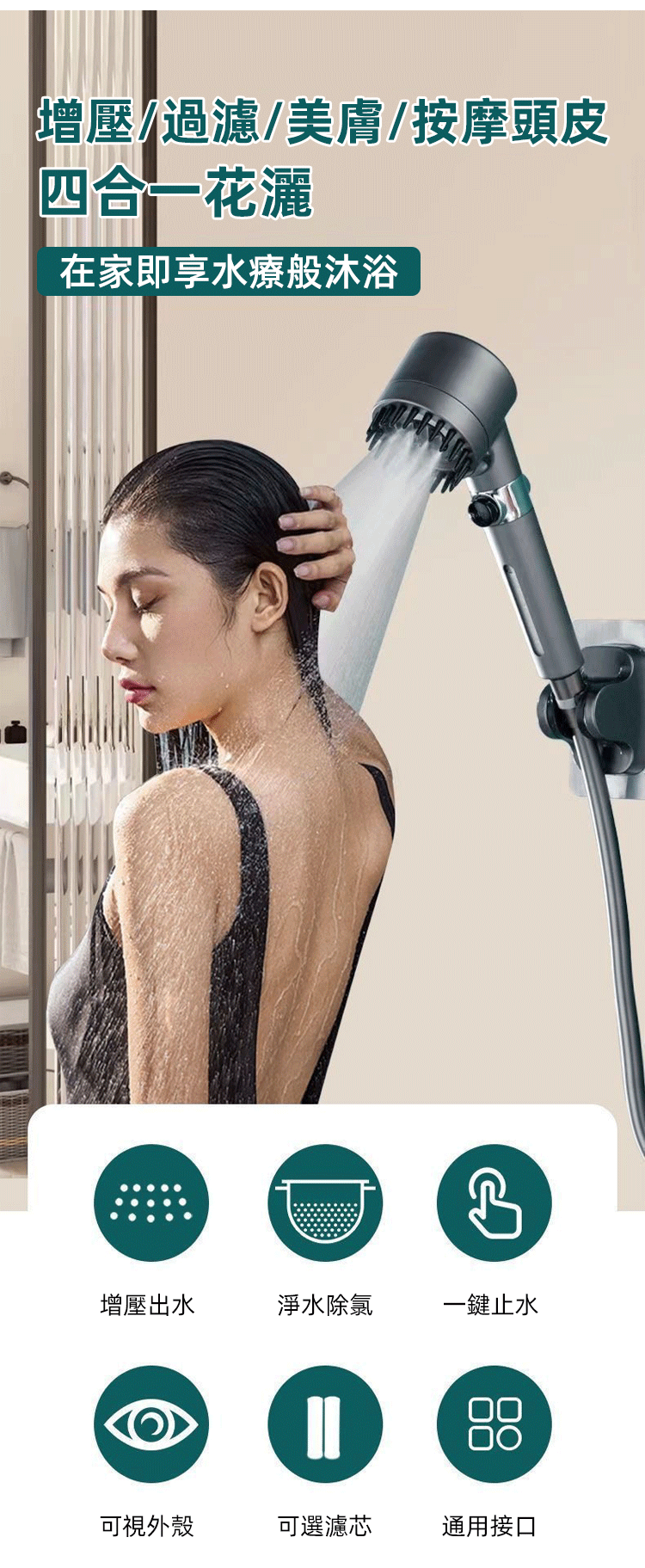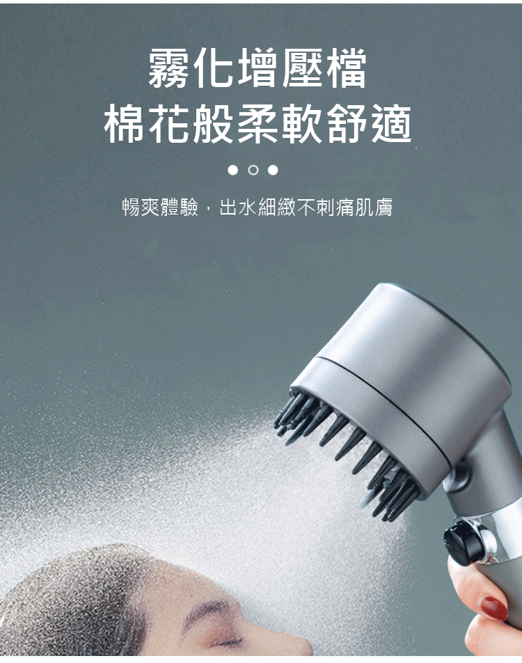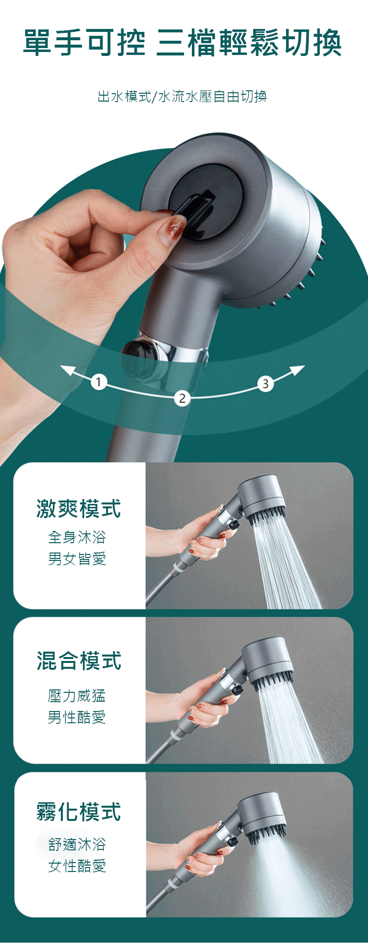 集按摩、護膚、加壓、過濾四大核心功能於一鍵調節,三種模式可選,輕鬆切換,在家即可享受專業級沐浴放鬆